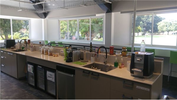 המטבח בירוק רחב ומאובזר במקררים, מיקרוגל, כלי אוכל, בר מים, מכונת קפה ועוגיות. בנוסף, יש אפשרות לרכוש כריכים, מוזלי או חטיף ופחית שתייה ממכונת החטיפים הצמודה. מי שלא מעוניין להביא אוכל מהבית יכול להזמין אוכל הודי, איטלקי, או להנות מהפסקה במרחק דקת נסיעה מארוחה ביומנגוס, ארומה ופלאפל בריבוע.